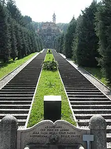 The sanctuary can be accessed via the 392 steps of the Scala Santa. Most are linear steps until the end with a scenic sweep of two arms. At the top is a modern bronze statue of Pope John XXIII by Enrico Manfrini. Below the belvedere, is a crypt with a stucco depiction of the founding miracle.[3]