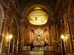 The interior of the sanctuary was renovated and enlarged in 1640 primarily, has a single nave with four side altars, in addition to another greater one where is kept and exposed to the veneration of the faithfuls a small Byzantine painting (which local legends say to be given by Maria herself as a gift to the inhabitants), placed permanently in 1743 in a Baroque Silver Pavilion donated by the noble Tomaso Noce. In the first altar on the right side it is possible to admire Giovanni Battista Carlone's painting Visitazione; in the second altar hangs a crucifix made in white marble by Francesco Schiaffino. In the same altar on the left side is preserved as well Carlone school's painting Annunciazione. The affrescature and pictorial decoration of the vault and apse were performed, respectively, by the painters Francesco Boero of Rapallo - with the representation, in four parts, of historical events and "miraculous" linked to the figure of the Byzantine icon - and the Genoese Nicolò Barabino that over the high altar (the work of nineteenth-century architect Luigi Rovelli) represented the scene of the Marian apparition to the farmer John Chichizola. The organ of the church was built in 1907 by Inzoli of Crema.