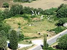 At the southern end of the middle terrace the nunnery stands on the site of the original villa Urbani, where a large mosaic pavement was found during construction of the villa in the 1600s with parts of a statue of Venus. An excavation in the building's foundations there in 2011[2] revealed an older temple had been built on the highest terrace. In the 2nd half of the 1st century BC the temple was extended with a new cella on the middle terrace below and a bi-coloured mosaic and new statue. This remodelling went together with a reconsecration of the old cult site to a new one of the imperial Caesarian cult of Venus Genetrix, central to Augustus's religious ideology at that time and entry into the religious heart of Umbria.[3] This remodelling was referred to in the inscription[4] found in the 1600s commemorating the commissioning of a statue to Venus by the duumvirs Marcus Granius and Sextus Lollius following a decree of the decurions of Hispellum. The extension of the old temple involved the construction of new walls and a new pronaos overlooking the valley, dated to ca. 27 BC, after Augustus had restored Via Flaminia.