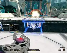 In the extermination phase, a wave of one or more enemy types moves across the level towards the core. With each enemy that reaches the core, the condition of the core degrades from 100%; when the condition reaches 0%, the game ends. Unlike most tower defense games, the player is allowed to move about the level during this phase and attack enemies with different weapon types, much like in a typical first-person shooter. Touching enemies will result in the player being knocked back, but no damage is done.