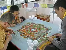 Tibetan Buddhist sand paintings usually composed mandalas. In Tibetan, it is called dul-tson-kyil-khor (mandala of coloured powders). The sand is carefully placed on a large, flat table. The construction process takes several days, and the mandala is destroyed shortly after its completion. This is done as a teaching tool and metaphor for the "impermanence" (Pali: anicca) of all contingent and compounded phenomena (Sanskrit: Pratītya-samutpāda).