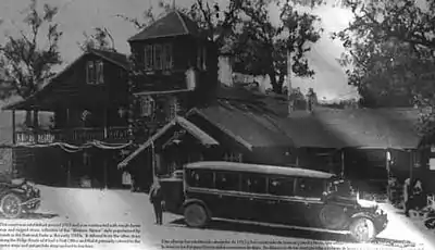 Harald built his lodge in 1914,[12] just one year before the opening of the Ridge Route resulted in a parade of cars by his front door, seven days a week. "Sandberg's lodge at the top of the grade was a welcome sight to weary [Los Angeles] motorists still only halfway to Bakersfield," the Los Angeles Times reported.[3] A hotel, restaurant, and cabins were constructed on leased Forest Service land immediately to the south of the homesteaded property.[11]