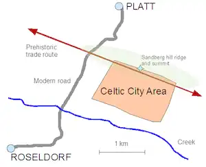 The Sandberg ridge (situated at 48°39′0″N 15°58′0″E) separates the villages of Platt and Roseldorf in the district of Hollabrunn. It consists almost entirely of fertile Löß soil and has been subject to intense agricultural use for centuries. Its summit, although not high, offers a panoramic view far into the surrounding countryside, suggesting strategic considerations might have played a significant role in the selection of the location. While the inhabited area (as far as it has been delineated by surveys) was situated on the southern slope of the hill on the territory of Roseldorf, Platt has much better logistic connections and traditionally harbors the archeologists' base camp.