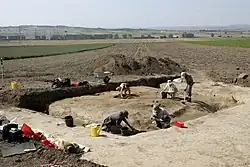 From 2005 to 2007, the three quadratic structures (one measuring 25 x 25 m, the other two slightly smaller) were completely excavated, and confirmed to have been Celtic sanctuaries of a Western European type not yet found in Central Europe, with their design closely resembling the cult site at Gournay-sur-Aronde in northern France.[3] They probably date back to the early La Tène period. In two of these structures the surrounding ditches contained large amounts of bones from animal and human sacrifices, ritually damaged weapons, coins, and several fibulae[4] A large, irregular-shaped pit adjacent to one of the two smaller sanctuaries, impressively rich in finds, was opened for excavation in August 2007.