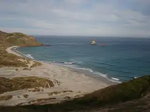 Sandfly Bay is approximately 1.5 kilometres (0.93 mi) across when measured in a straight line between the headlands. On the western side the cliffs of Seal Point rise directly out of the sea in a near-straight wall about 900 metres (3,000 ft) long; beyond Seal Point along the coast lies Boulder Beach. On the eastern side lies a 1.1 kilometres (0.68 mi) white sand beach, facing south-southwest, crossed by the mouth of Morris Creek flowing in from the north. Towards the eastern end of the bay the dunes rise to over 100 metres (330 ft) above the shoreline, forming the lower slopes of Sandymount. The beach ends in a rocky headland, with an assortment of small islands known as the Gull Rocks standing out of the sea off its southern point.[1] The largest of these is known as Lion Rock or Lion's Head Rock, due to its shape. A distinctive landmark, it can be clearly seen in good weather from Second Beach, close to Saint Clair, 18 kilometres (11 mi) to the west. East of this headland the Otago Peninsula coastline turns northeastward at Harakeke Point.[1]