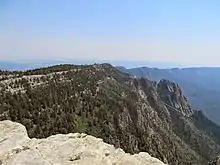 Sandia Crest, also known locally as Sandia Peak or simply as the Crest,[2] is a mountain ridge that, at 10,679 feet (3,255 m), is the highpoint of the Sandia–Manzano Mountains, and is located in the Sandia Mountains of Bernalillo County, New Mexico, United States. Instead of a true summit or topographic peak, this range climbs to a long ridge line. To the east, the range slopes down from the Crest and merges into the plains below. On the west side of the Crest is a cliff; the range dramatically drops over 4,000 feet (1,000 metres) in elevation over 2 miles (3 kilometres) of horizontal distance to the Rio Grande Valley and city of Albuquerque below. It is within the Sandia Ranger District of the Cibola National Forest. The Crest features a viewing area with a shop and visitor center, telecommunications transmitters, the popular La Luz Trail, the Sandia Mountain Wilderness, and the summit of Sandia Peak Ski Area and the Sandia Peak Tramway, which is the longest aerial tramway in the Americas.