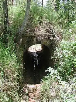 The culvert comprises a long tunnel, about 1.2 metres (3 ft 11 in) wide, beneath an unsealed roadway. It is lined on the floor and to about a third of its height along the sides with rusticated sandstone blocks. The blocks lining the floor are long and considerably narrower than those lining the side. There are two courses of blocks on each side of the culvert. The arched roof of the culvert is lined with bricks.[1]