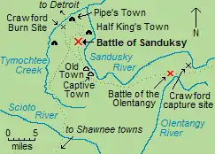 After being separated from the main body of men, Crawford, Knight, and four other stragglers traveled southeast along the Sandusky River in present-day Crawford County, Ohio. On June 7, they came upon a party of Lenapes about 28 miles (45 km) east of the battlefield. Knight raised his gun, but Crawford told him not to fire. Crawford and Knight knew some of these Lenapes, who were part of a band led by a war chief named Wingenund.[135] Crawford and Knight were taken prisoner, but the other four Americans escaped. Two of them were later tracked down, killed, and scalped.[136] Crawford and Knight were taken to Wingenund's camp, where they found eight other prisoners.[137] On June 9, while the other prisoners were taken to Old Town, Crawford was taken to Half King's Town where he met with Simon Girty. Girty told Crawford the Lenapes were enraged about the Gnadenhütten massacre, and offered to assist Crawford in escaping, but Crawford was too exhausted and discouraged to make an attempt.[137]