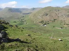 The main area of habitation in the valley itself is situated in its lower area where the road comes over the hause from Howtown. Here there is Hause Farm, The Old Reading Room and a few self-catering holiday homes. At the top of the hause is St Peter's Church often referred to as the New Church, it dates from 1880.[6] Half a kilometre further up the valley is the restored St Martin's Church, the present building dates from the end of the 16th century.[7] Other farm buildings in the mid and upper parts of Martindale are Winter Crag, Knicklethorns, Henhow, Thrang Crag and Dale Head.