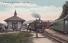 As part of the New England transportation monopoly organized by the New York, New Haven & Hartford Railroad, the SR&RL operated as a subsidiary of the Maine Central Railroad from 1912 until receivership in 1923.[4] Maine Central built 37 box cars, 37 flat cars, 3 cabooses and a baggage-RPO car in their Portland Terminal Company shops for the SR&RL between 1912 and 1917.[5] SR&RL locomotives 15, 16, 17 and 18 were reboilered in the Maine Central Waterville shops during the same period, and a 4-mile (6.4 km) freight branch was built from Perham Junction to Barnjum.