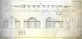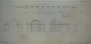 On the western entrance a triumphal arch stood, while on the eastern side there are the remains of an apse, whose function is unclear, but possibly served as a religious shrine.[3] The apse features an East-oriented half-dome, and is 11 m high and 9 m wide.[12] The remains of the arch, now vanished, are illustrated in the sketches made in 1838 by Léon de Laborde: they depict an arched doorway, made of stone masonry, lying immediately at the entrance of the bridge.[13] The next sketch provides some measured dimensions: the doorway was 10.37 m high and 6.19 m wide, while the pillars to either side were 4.35 m thick.[14]