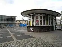 The present entrance building, which is located south of the railway tracks, was built in 1963. It was the first station to be built[4] in the GDR and is protected as a monument. The painter and graphic designer, Wilhelm Schmied created a particularly striking wall mosaic in the station's entrance hall. It shows the Mansfeld Land with its agriculture and mining. The round kiosk on the forecourt was built in 1957.