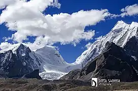 ![]() View from the north over the Gurudongmar glacier to the Sanglaphu, seen in the half left of the image (October 2014) | |