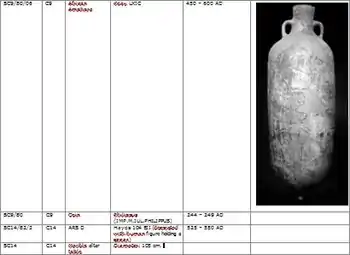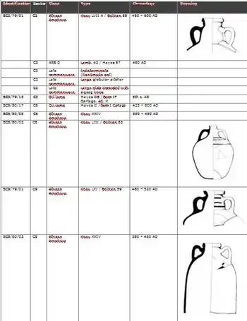 - TS Claras A and D, Grey early Christian pottery, African amphorae like Keay LXI, with a chronology ranging from 450 to 700 AD.
