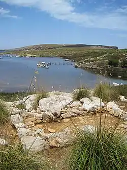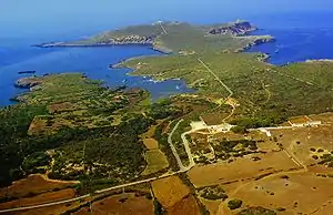 The archaeological site of Sanisera is located in the natural port of Sanitja, next to the Cavalleria Cape or Cap de Cavallería (Es Mercadal), which is placed on the rocky northern coast of the island.[2] Cavalleria Cape is a peninsula which points to the north, whose eastern end is called Punta Llevant (eastern point), an 89-metre-high cliff which presents a 19th-century lighthouse; and whose most important inlet is the Port of Sanitja. The western part of the port consists of a long sub-peninsula, whose most characteristic element is an English watchtower built at the beginning of the 19th century, located at its northeastern end. Close to the coast, there are two small rocky islands which act as breakwaters. Regarding the eastern side of the port, it presents similar characteristics to those of the western side, and where S’Almadrava is located, a house which was built in the 18th century as a shelter for fishermen. Moreover, an old quarry of limestone and a lime kiln are located to the south of the port, possibly belonging to the 18th or 19th century. All these elements help the visitor understand the importance of the port of Sanitja, which, despite its small dimensions in comparison to other ports in the island, has always been an inducement of different nature throughout History.