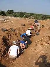 After the excavation of building C, the same team started to investigate an area where there was a large concentration of materials as well as a monolithic stone sarcophagus on the surface.[26] Archaeologists located a building with rectangular rooms and Opus signinum pavements that presented a cluster of tombs both inside and outside its limits.
