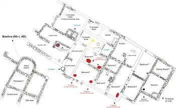 Excavations carried out between 2008 and 2010 have revealed an ecclesiastical complex at the west side of the port of Sanitja. This complex, which possibly dates from the 6th century AD,[29] consists of a basilica and a large multi-functional building, called Building 10. This building presents a series of rooms, some of them used as stores, deposits and cisterns, while others were bedrooms, kitchens, latrines, dining-rooms and courtyards.