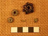 As for grave goods, personal ítems have been found in some of the tombs. They include earrings, rings, pendants, ceramic beads, glass paste beads and clothes pins. The key features missing to provide us with a more concrete date and a more concrete cultural influence are brooches, cloak pins and belt buckles. Most of the materials recovered from the graves date from the 6th century AD and are comparable to objects located in other Late Antiquity necropolei from the Iberian Peninsula and the Balearic Islands. Without being able to ascertain if the interred population was of Hispano-Roman, Vandal, Byzantine or Visigoth origin, it can be asserted that Necropolis 6 contained the remains of a population living in or around the Port of Sanitja during the 6th century AD. Among the most frequently found materials, it is worth mentioning the bronze and silver hoop earrings, bronze rings and glass paste beads of different shapes and sizes, some of them even reused from Punic times.