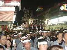 Sanja Matsuri (三社祭, literally "Three Shrine Festival"), or Sanja Festival, is one of the three largest Shinto festivals in Tokyo. It is considered one of the wildest and largest.[2] The festival is held in honor of Hinokuma Hamanari, Hinokuma Takenari, and Hajino Nakatomo, the three men who established and founded the Sensō-ji Buddhist temple. Sanja Matsuri is held on the third weekend of every May at Asakusa Shrine.[3] Its prominent parades revolve around three mikoshi (portable shrines referenced in the festival's name), as well as traditional music and dancing. Over the course of three days, the festival attracts 1.5 to 2 million locals and tourists every year.[4]