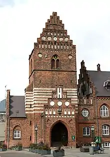 The Sankt Laurentii Church Mama Tower is all that remains of Sankt Laurentii Church in Roskilde on the Danish island of Zealand. The church itself was built of travertine in the Romanesque style in the 13th century but was torn down after the Reformation leaving only the tower from the beginning of the 16th century. The tower now forms part of the former town hall.[1] It contains a museum where archaeological finds from 1998 can be seen.[2]