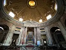 Inside, the main entrance is located on the short axis of the church and directly faces the high altar. The oval form of the main congregational space of the church is defined by the wall, pilasters and entablature, which frame the side chapels, and the golden dome above.[2] Large paired columns supporting a curved pediment differentiate the recessed space of the high altar from the congregational space.