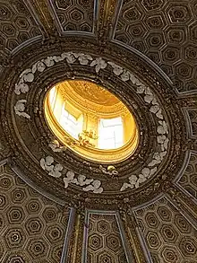Over the High Altar is an oil painting of the Martyrdom of Saint Andrew (1668) by French painter Guillaume Courtois, a depiction which shows Andrew tied to the diagonals of the form of the cross on which he was crucified. Andrew appears for a second time as if he were breaking through the curved pediment of the edicule frame to the high altar; this time he is represented by a white stucco sculpture carved by Antonio Raggi. He is shown on a cloud, designating a heavenly appearance, and, with his arm outstretched and gaze cast upwards, he indicates that he is on his way to heaven as represented by the golden dome, the stucco cherubim heads clustered around the opening to the lantern, and the lantern vault with the Dove of the Holy Ghost.[3] This dramatic visual narrative is sustained not only upwards through the space of the church but employs different artistic modes. Bernini combined painting, sculpture and architecture into a synthesis to create visually the idea of the apotheosis of St Andrew in this spiritual theater. He used a similar synthesis of artistic modes in his design of the Ecstasy of Saint Theresa in the Cornaro Chapel of Santa Maria della Vittoria. This synthesis has been referred to as the ‘unity of the visual arts’.[4]