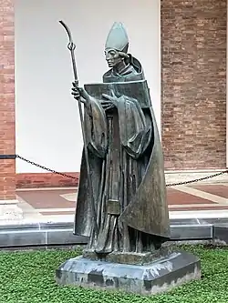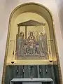 The area of the Sant'Anselmo complex open to the general public is the church which was consecrated on November 11, 1900. The church was consecrated by Cardinal Mariano Rampolla del Tindaro, assisted by twelve cardinals, sixteen archbishops and bishops, fifty-two abbots, rectors of all the major colleges of Rome, superiors general of the major religious orders, and all ambassadors accredited to the Holy See.[6] It is constructed of three naves, divided by granite columns, and includes one main altar and two side altars. The ceiling is a truss and the crypt was made of five naves with sixteen side altars. In 1952 there was a renovation of the church interior by architect Fritz Metsger. This saw the construction of elevated choir stalls for the monks in the transepts, the addition of an altar under the arch that allowed the priest to face either direction in celebrating mass, and the creation of three main mosaics by the German monk Radbodus Commandeur. The mosaics are located above the two side altars, as well as above the main apse which depicts the jeweled cross between angels and Saints Benedict and Anselm. Commandeur also completed the mosaic under the main altar covering the reliquary containing the relics of Saint Alexander of Rome. He also produced numerous pieces within the monastic enclosure of the College as seen in the gallery of photos below.[7] The paschal candle stick is modern but in the Cosmatesque style. The lower level has now been converted to the use of the library for the University. In the courtyard of the atrium, there is a bronze statue of Saint Anselm made in 1966 by Swiss sculptor Albert Wider from Widnau. From here, it is possible to see Santa Maria del Priorato of the Knights of Malta, which lies in an adjacent complex that is closed to the public. In the entrance to the Sant'Anselmo complex, reached from the atrium, is a Roman Orpheus mosaic from a second-third century home that was found during construction.[8][9]