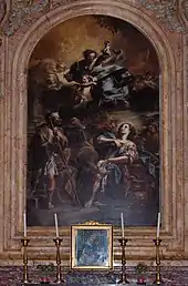 The main altar was commissioned by Cardinal Neri Corsini and designed by the architect Nicola Salvi. He made it into an elegant and refined synthesis of marble and gilded metal. The top of the altar rests on an urn in porphyry rosso antico, the costly stone of the ancients, that contains the putative relics of Saint Eustace. The altarpiece was painted in 1727 by Francesco Ferdinandi (1679–1740), also named "l'Imperiali". It represents the martyrdom of Saint Eustace and his family who were roasted to death inside a bronze statue of a bull or an ox, in the year AD 118. The gilded wooden baldachin (circa 1746) over the main altar is attributed to Ferdinando Fuga (1699–1781).
