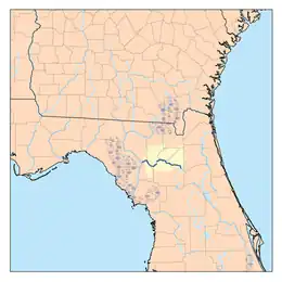 Springs like Gilchrist Blue, Ginnie, Hornsby, Lily, Poe, and Rum Island springs are located at the banks of the river, mostly downstream of the river's reappearance above ground level.[7] The water temperature near the numerous springs is always around 72 °F (22 °C).[8] The area is sparsely populated compared to the rest of Florida, there have been sightings of animals like the black bear, bobcat, the rare Florida panther and due to the near-constant water temperatures along many portions of the river, manatees.[9] As with many rivers in Florida, plant and animal fossil remnants are plentiful along the Santa Fe.[10][11][12]