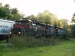 Pan Am Railways locomotive #621, an SD26, in Westford, Massachusetts (2007). The "blower bulge" (just aft of the cab) and the displaced roof-mounted "torpedo tube" air reservoirs — two distinct SD26 spotting features — are clearly visible.