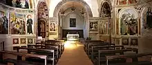 The entrance lunette dated 1500 depicts a Madonna della Misericordia between Santa Chiara da Montefalco and the Blessed Giovanna attributed to Francesco Melanzio. In the first chapel to the left is a fresco depicting St Nicola da Tolentino between Saints Sebastian and Augustine, and Santa Chiara of Montefalco, the blessed Giovanna (sister of Chiara of Montefalco), Ste Catherine of Alexandria and Santa Illuminata of Todi (1507) attributed to followers of Bernardino Mezzastris. The second chapel on the left has a series of frescoes (circa 1507) attributed to Melanzio. The second chapel on the right is also attributed to Melanzio, and depicts an Assumption of the Virgin with Saints Agatha, Lucy, Augustine, and Gregory the Great and a Coronation of the Virgin with the four evangelists (1507). To Melanzio is also attributed the frescoes in the apse depicting a Pietà and a Mary Magdalen (1509).