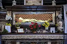 The rich marble mausoleum on the left of the transept by the Sienese workshops and the saint's silver casket (1774) at the main altar, displaying her incorrupt body, was designed by Pietro Berrettini.[3] The main altarpiece once held a large Deposition by Luca Signorelli, now in the Diocesane museum.[4] The marble statue (1781) of the saint in a niche on the right was sculpted by Vincenzo Pacetti.[5]