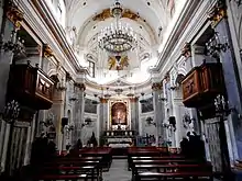 In 1784, the church was refurbished by the architect Antonio Interguglielmi. The interior has a restrained neoclassical decoration. In the apse are frescoes depicting the Life of the Virgin Mary by Elia Interguglielmi, brother of Antonio. The main altar was decorated with works by Ignazio Marabitti. The statues of the four doctors of the Church, which line the nave, were completed by Gaspare Firriolo.[1]