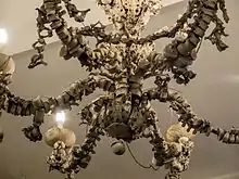 It is remarkable for the depictions of laureled skulls over the façade entrance and other death imagery.[3] There are two engraved plaques on each side of the facade: one depicts a winged skeleton with the inscription "Hodie mihi, cras tibi", i.e. “Today for me, tomorrow for you”, the other, over an almsbox, is the seated death who, holding a winged hourglass in his hand, observing a dying man.[4] Over the main door is a curvilinear tympanum that encloses an aedicule with a winged hourglass, a symbol of the incessant passing of time towards death. The church is an example of the cult of death, also seen in the Roman church of the Capuchins.