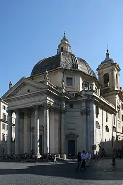 Santa Maria in Montesanto is a church of Rome, in the Rione Campo Marzio, which stands in Piazza del Popolo, between Via del Corso and Via del Babuino. It is also known as the Church of the Artists. The church is popularly known as the twin church of Santa Maria dei Miracoli, though it shows significant differences especially in the planimetry.