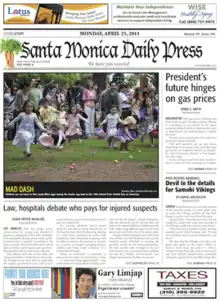 The Santa Monica Daily Press is a freely distributed microdaily newspaper in Santa Monica which was founded in 2001[1] by Dave Danforth, Carolyn Sackariason, and Ross Furukawa. The Santa Monica Daily Press is the only local daily newspaper in circulation in Santa Monica, California. The Daily Press has a circulation of 28,000 and a readership of 43,600.
