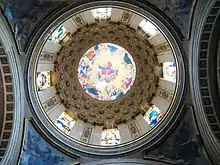 The cupola dome interior's mural, above the stained-glass windows, was painted by Juan Cordero with an image of "God, the Father" surrounded by images representing virtues.[3]