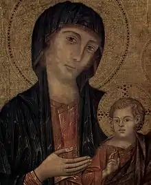 The Santa Trinita Maestà (Italian: Maestà di Santa Trinita) is a panel painting by the Italian medieval artist Cimabue, dating to c. 1290-1300. Originally painted for the church of Santa Trinita, Florence, where it remained until 1471, it is now housed in the Uffizi Gallery of Florence, Italy. It represents the Madonna enthroned with the Baby Jesus and surrounded by eight angels and, below, four half portraits of prophets.