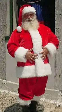 There are regional differences in the type of suit that Santa Claus wears. Typically in the United States and United Kingdom, he wears a white fur trimmed red jacket and pants with a broad buckled belt, a matching hat, and black boots.[3] In Continental European countries such as the Low Countries or Austria, with Saint Nicholas still remaining popular, the outfit is closer to that of the saint, being a long robe and a Bishop's mitre.[6]