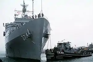 ![]() Santaquin (YTB-824) assists the dock landing ship USS Portland (LSD-37) into her berth at Naval Amphibious Base, Little Creek, VA., 20 April 1991. | |