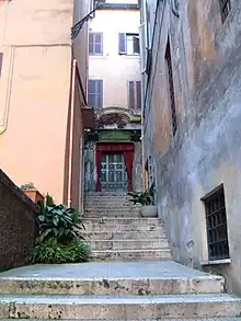 The building lies in rione Ponte, at the top of Monte Giordano, an artificial hill to the south-east of Ponte Sant'Angelo, created in the Roman era from the rubble from the nearby marble quay on the Tiber.[1] It can be reached by a staircase which is part of Via di San Simone, a side lane of Via dei Coronari overlooking the south side of the church of San Salvatore in Lauro. The church could once also be accessed on the southwest side, from Via della Vetrina.