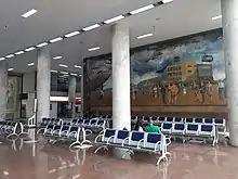 It was also in 1936 that the construction of a new passenger terminal began. It was a project led by the architects MMM Roberto (Marcelo, Milton and Mauricio Roberto Doria-Baptista) inspired in the Paris - Le Bourget Airport terminal. Its pioneering, modernist, architectural features created a Brazilian national landmark. It was only in 1947 that its construction was completed. This building continues to be used to the present day. In the lobby of this terminal, (now the arrivals terminal) two monumental paintings by Cadmo Fausto de Sousa can be seen. Named "Old Aviation" and "Modern Aviation", they feature many old and new means of flying. Both were unveiled in 1951.[6]