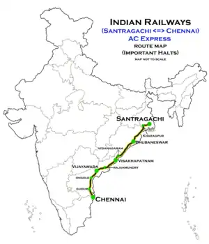 The 22807 / 08 Santragachi–Chennai Central AC Express is a Superfast Express train belonging to Indian Railways – South Eastern Railway zone that runs between Santragachi Junction and Chennai Central in India.