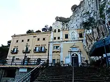 Located high on the mountain, upon arrival to the locale, one ascends from a herd of souvenir stands to the sanctuary proper by an arduous staircase of over 70 steps. The yellow three story structure has a church facade on the right, merging with the cliff. The left structure has a frieze reading Pio Refugio Orfanelli Santa Rosalia/ Opera Don Orione, recalling the presence of a former orphanage for girls at the site. Since 1946, the custodians of the Sanctuary are Orionine brothers, members of a congregation called Sons of Divine Providence.[2]