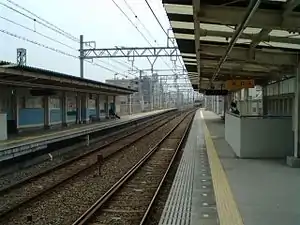 The station consists of two elevated side platforms with the station building underneath. The station is unattended.