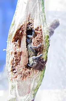 The beetles can be found from May to July, with the female makes a horseshoe shaped cut and laying an egg in the incision.[3] The gall develops in an internode as a symmetrical swelling, which can be 20 mm long, and contains a yellowish larva or pupa in a single elongate chamber. An exit hole is made in the spring.[4] It is most common on apen (Populus tremula) and also found on black cottonwood (P. trichocarpa), black poplar (P. nigra) and goat willow (Salix caprea).[5] In Britain the gall is commonest on the young twigs of aspen.[4]
