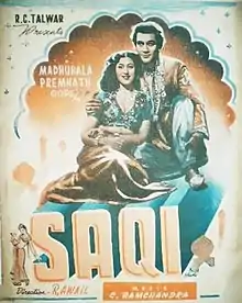 Saqi (transl. "Bartender") is a 1952 Indian Hindi-language film directed by H. S. Rawail and starring Premnath, Madhubala in lead roles.[2] The film's music was composed by C. Ramchandra. Saqi was based on Arabian Nights and was one of the most expensive Indian films at the time of its release.[1]