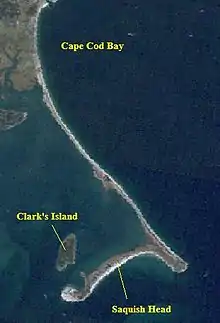 Saquish was likely an island at the time of the arrival of the Pilgrims.[1][2][3] The prevailing story concerning the name "Saquish" is that it derives from a Wampanoag name meaning "abundance of clams", but one writer says he believes it to mean "small creek".[4]