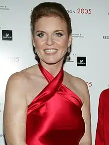 In 1990, Sarah became patron of the Teenage Cancer Trust. She has since opened most of the charity's various units, including those at Middlesex Hospital, University College London, St James's University Hospital, Cardiff University Hospital and Royal Marsden Hospital.[103] Sarah began her work with people suffering from motor neurone disease in the 1990s. In her capacity as patron of the Motor Neurone Disease Association, she promoted fundraising campaigns for research about the disease and later became president of the International Alliance for ALS.[104][105] To help and support those affected by drug misuse, she joined therapy sessions at the Chemical Dependency Centre and was later made their patron.[105] In 1993, Sarah founded Children in Crisis, a children's charity focused on education and grant making to international programmes. Sarah serves as founder and life president.[106] She founded the charity after meeting a young cancer victim named Anya during her visit to Poland in 1992.[107]