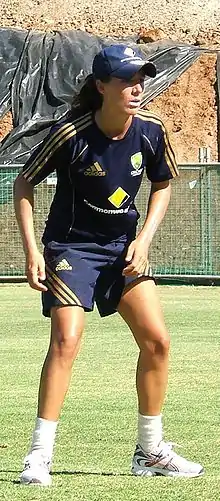 Andrews was rewarded with selection for Australia for the home series against India held in Adelaide at the end of the season. She made her debut in the one-off Test at the Adelaide Oval, and came in at No. 11 after Australia batted first. she made three from six balls before being run out as the hosts made 250.[4] Opening the bowling with Cathryn Fitzpatrick, she took 2/29 from nine overs in the first innings. She had opener Monica Sumra caught by Karen Rolton in her second over, and then trapped the other opener Karu Jain for 21 to leave the Indians at 2/41. In the following over, without further addition to the score, Andrews took her maiden Test catch to dismiss leading Indian batsman and captain Mithali Raj from the bowling of Fitzpatrick. The Indians eventually collapsed to be all out for 93. Australia enforced the follow on and Andrews took 0/19 from 17 overs and caught Sunetra Paranjpe in the second innings as the tourists lost by an innings.[2][4] After missing the first ODI, she made her debut in the second match, coming in at No. 11 and scoring four not out from seven balls in Australia's 173 all out.[2][5] She then took 3/21 from six overs to help secure a 12-run win. In the next match she took 1/33 in a nine-wicket win and ended the series with four wickets at 13.50 and an economy rate of 3.33.[2] Andrews is the 148th woman to play Test cricket for Australia,[6] and the 106th woman to play One Day International cricket for Australia.[6][7]